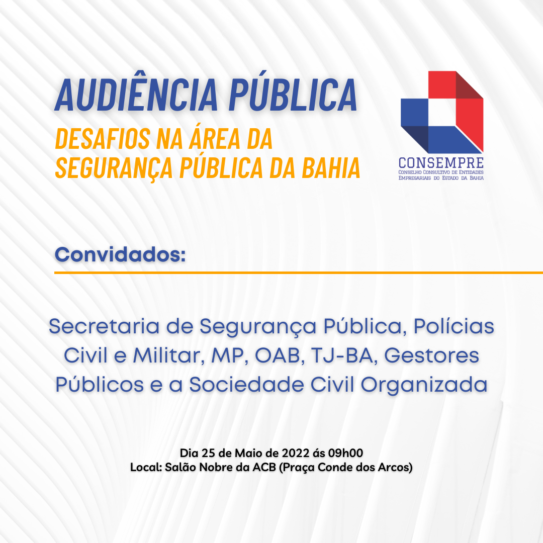 Na próxima quarta-feira (25), às 09h, a Associação Comercial da Bahia (ACB), em parceria com o Conselho Consultivo das Entidades Empresariais da Bahia (Consempre), vai promover uma audiência na sede da entidade, no bairro do Comércio, para discutir a situação da segurança pública em nosso estado.