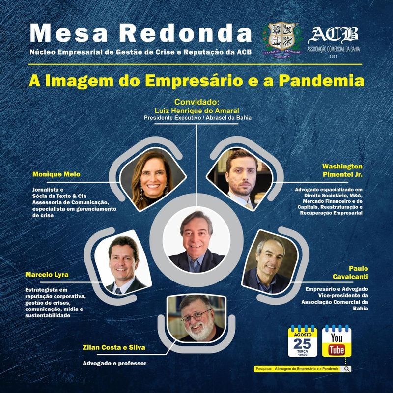 A Associação Comercial da Bahia agora conta com um Núcleo Empresarial de Gestão de Crise e Reputação. E para lançar a novidade vamos debater “A imagem do empresário e a pandemia”, na próxima terça-feira (25), a partir das 19 horas, através do YouTube, com a ilustre presença de Luiz Henrique do Amaral, Presidente Executivo da Associação Brasileira de Bares e Restaurantes (Abrasel da Bahia). “A reabertura da atividade econômica em meio a pandemia do coronavírus apresenta muitos riscos, principalmente para o setor de bares e restaurantes. Por isso nossa ideia de iniciar o ciclo de eventos com um tema bastante atual”, convida Paulo Cavalcanti, coordenador do Núcleo e vice-presidente da ACB. O evento será transmitido ao vivo no YouTube. Link de acesso: https://www.youtube.com/watch?v=aVvrgGjw3D8