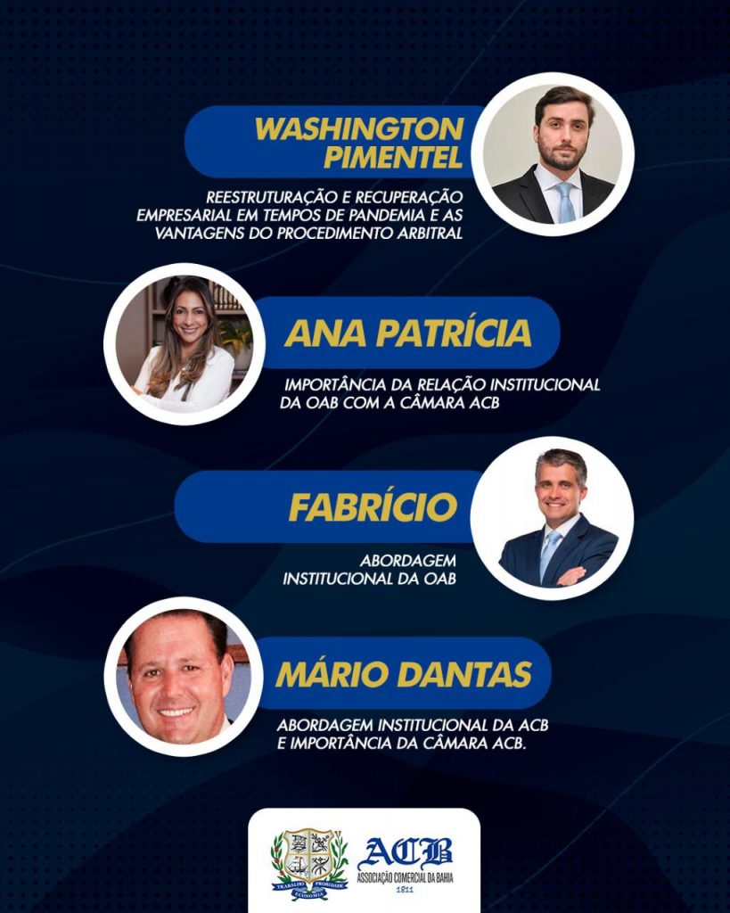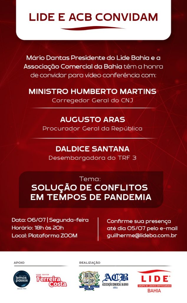 No intuito de levar aos empresários, advogados e a comunidade baiana, conteúdo e informação nesse momento de pandemia, a Associação Comercial da Bahia e o Lide BA, realizam videoconferência, sob o Tema: “Solução de Conflitos em Tempos de Pandemia”, a ser realizada no dia 06/07/2020 (segunda- feira), das 18:00 às 20:00, na Plataforma ZOOM.