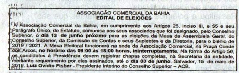 Edital eleição da Associação da Comercial da Bahia 2019