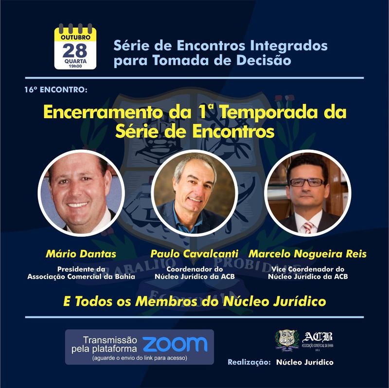 Após a realização de quinze Encontros Integrados para Tomada de Decisão, o Núcleo Jurídico da Associação Comercial da Bahia (ACB) promove mais uma edição do evento nesta quarta-feira (28), a partir das 19 horas, para fazer um amplo balanço de tudo o que foi debatido e os principais resultados alcançados durante a primeira temporada. Com transmissão através da plataforma ZOOM, estarão presentes o presidente da ACB Mário Dantas, o coordenador do Núcleo Jurídico Paulo Cavalcanti, o vice-coordenador Marcelo Nogueira Reis, além dos integrantes do órgão. “Nesta primeira temporada pudemos realizar debates importantes, sobretudo neste momento de pandemia, e seus impactos na atividade empresarial. Personalidades de destaque em diversas áreas nos brindaram com análises aprofundadas e nos auxiliaram em tomadas de decisões positivas. Agora vamos fazer uma retrospectiva dos principais temas abordados e iniciar os preparativos para uma nova sequência com a mesma qualidade”, comemora Paulo Cavalcanti. O Encontro Integrado é aberto para a sua participação através de perguntas, comentários e sugestões. - @nucleojuridicoacb - (71) 99681 0707 Link para acesso: https://us02web.zoom.us/j/89966159670