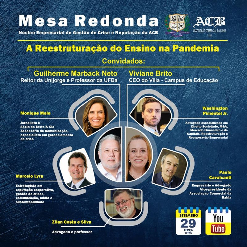 O Reitor da Unijorge, Professor Dr. Guilherme Marback Neto, e a CEO do Villa Campus da Educação, Viviane Brito, são os próximos convidados da Mesa Redonda do Núcleo Empresarial de Gestão de Crise e Reputação da Associação Comercial da Bahia (ACB). Com tema “A Reestruturação do Ensino na Pandemia”, o evento acontece nesta terça-feira (29), no canal da ACB no YouTube. Devido ao distanciamento social, diversos setores da sociedade precisaram se adaptar a esse “novo normal” para poderem retomar as suas atividades. Na educação esse cenário não está sendo diferente e as instituições de ensino estão se reinventando rapidamente para dar continuidade ao período letivo. Conduzido pelo vice-presidente e coordenador do Núcleo Empresarial de Gestão de Crise e Reputação da Associação Comercial da Bahia, Paulo Cavalcanti, o encontro quinzenal conta ainda com as presenças da jornalista Monique Melo, do estrategista Marcelo Lyra, do advogado Washington Pimentel e do professor Zilan Costa e Silva. A cada edição, especialistas de diversas áreas são convidados para discutir assuntos pertinentes aos novos desafios impostos pela pandemia. “A educação é a base da formação de uma civilização. Trata-se de um tema que precisa ser debatido sempre com muita atenção e cuidado, por ser de fundamental importância para toda a sociedade”, justifica Cavalcanti. A Mesa Redonda pode ser acompanhada através do link https://youtu.be/i-8LG9jnQ_s