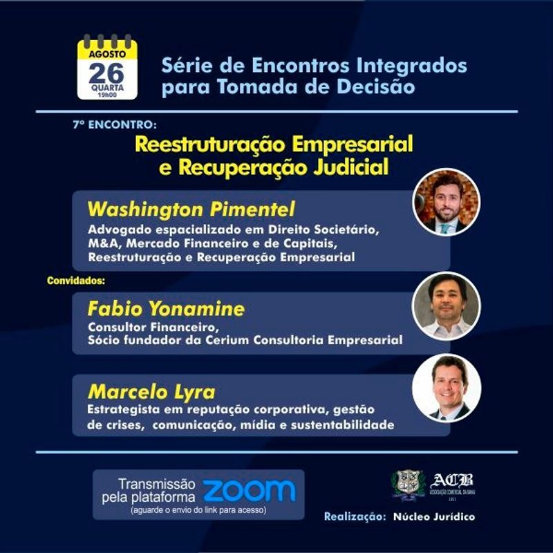O Encontro Integrado para Tomada de Decisão desta quarta-feira (26) recebe três renomados especialistas para debater reestruturação empresarial e recuperação judicial, tema que ganha ainda mais importância diante da crise causada pela pandemia do coronavírus. Advogado especialista em reestruturação empresarial e recuperação judicial, Washington Pimentel tem a companhia do consultor financeiro Fábio Yonamine, com sua experiência de CEO da OAS Investimentos e Empreendimentos e responsável pela recuperação judicial do Grupo OAS, além do estrategista Marcelo Lyra, que já ocupou cargos como a vice-presidência de comunicação da Odebrecht e Braskem. O encontro acontece a partir das 19 horas, pela plataforma ZOOM. Participe com sugestões e questionamentos: - @nucleojuridicoacb - (71) 99681 0707 Link para acesso: https://us02web.zoom.us/j/89966159670