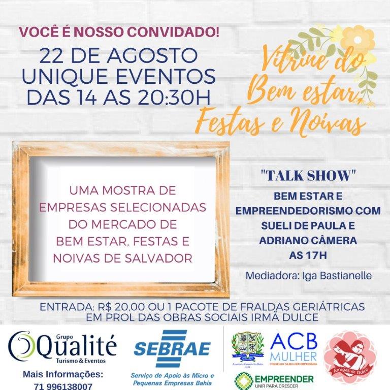 O Sebrae Bahia, o Conselho da Mulher Empresária da Associação Comercial da Bahia - ACB e a Qualitè Eventos decidiram se unir para desenvolver a Vitrine do Bem Estar, Festas e Noivas, um evento com proposta beneficente que apoia a Rede Amigas de Dulce.A Vitrine acontecerá na próxima terça feira, 22 de agosto, no Espaço Unique, das 14 às 20:30h e reunirá empresas do setor de festas e bem estar para Networking e bons negócios. Será apenas um dia de exposição em um espaço diferente, onde as empresas ficarão mais próximas de seus clientes e parceiros, buscando novos conhecimentos e experiências.No Espaço Unique, o público encontrará fornecedores que vão desde clínicas de estética, buffets, hotéis, espaços para eventos, cakes designer, alugueis de roupas de festa, decoração, spa, entre outros parceiros que integram este segmento de festas.Além da Vitrine, o Sebrae Bahia e o Conselho da Mulher Empresária da ACB – Associação Comercial da Bahia desenvolveram um conteúdo especial sobre Empreendedorismo e Bem Estar que será passado aos presentes através de um Talk Show que acontecerá a partir das 17 horas com a participação de Adriano Câmera – Consultor da Federação das Associações Comerciais e Empresariais da Bahia, Sueli de Paula – Diretora Executiva da Paula Consultoria e Diretora de Negócios do Conselho da Mulher Empresária da ACB, com mediação de Iga Bastianelli - jornalista, Consultora de Comunicação/MKT e editora do BN Mulher . O talk show será seguido por uma palestra da empresária de moda Anna Libório que falará sobre: “Mulher, Moda e Serotonina – A dinâmica da Felicidade”